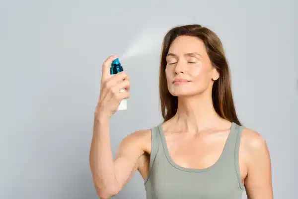 - Rist godt før hver bruk. Med lukkede øyne, spray 3–5 pump over ansiktet, halsen og brystet. La tørke.